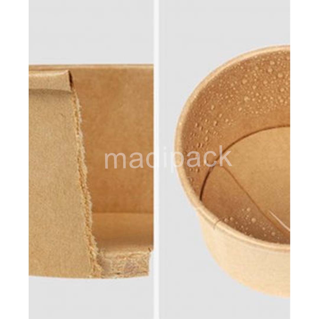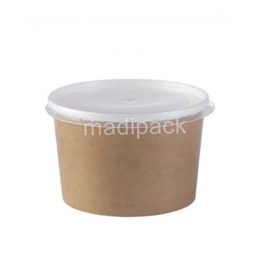 Brown cardboard soup pot with transparent or cardboard lid, Disposable soup pot made of thick brown cardboard, Leak-proof closure system: no leaks during transport, Microwaveable