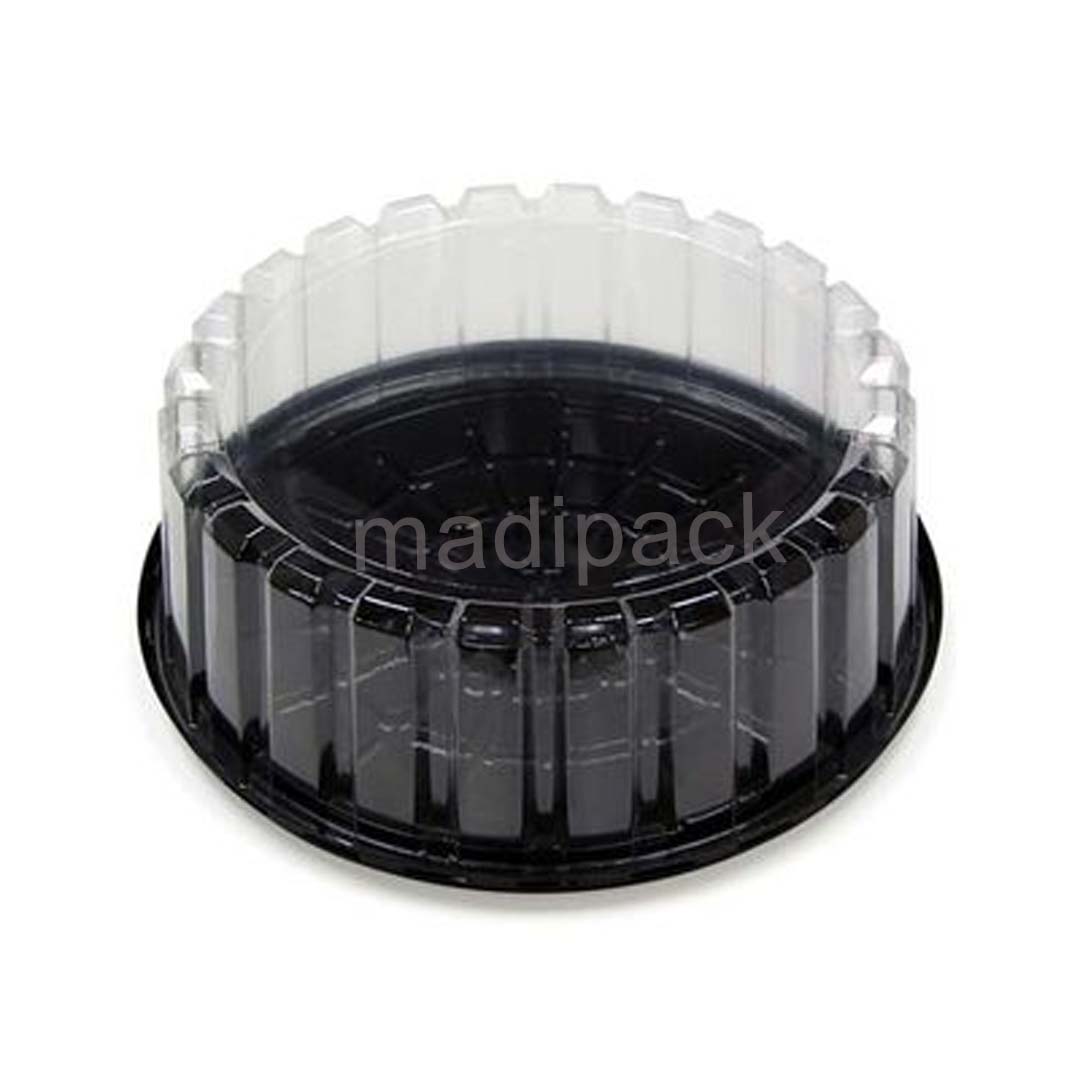 Plastic cake container with black base and clear lid