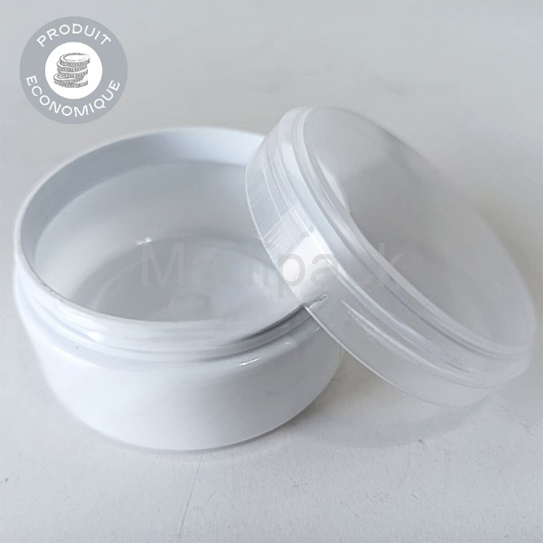 These empty jars are perfect for storing creams, lotions and cosmetics. Material: Plastic Capacity: 100g Jar Color: Opaque White Lid Color: White / Clear