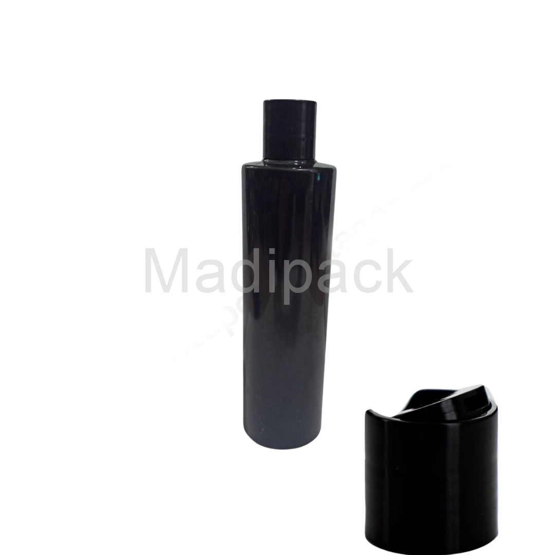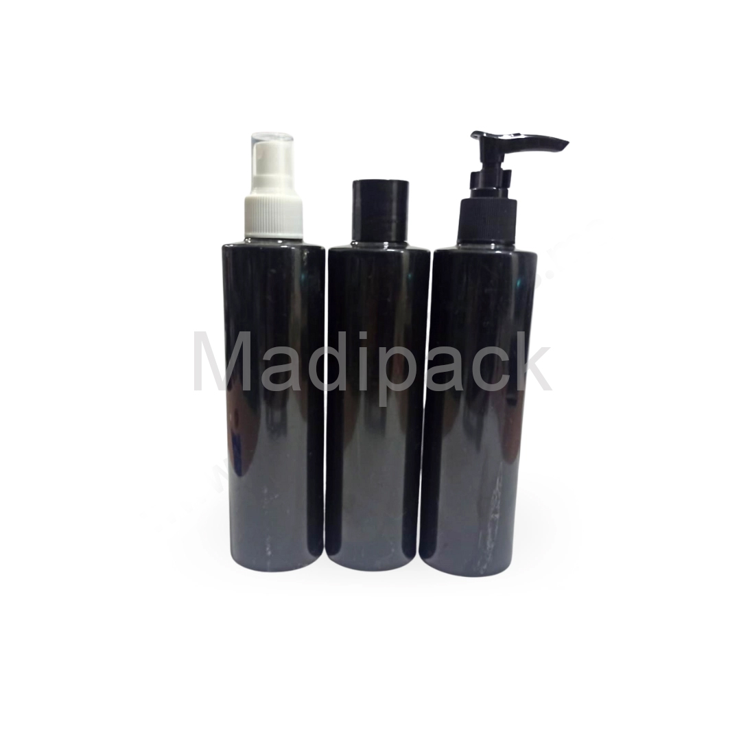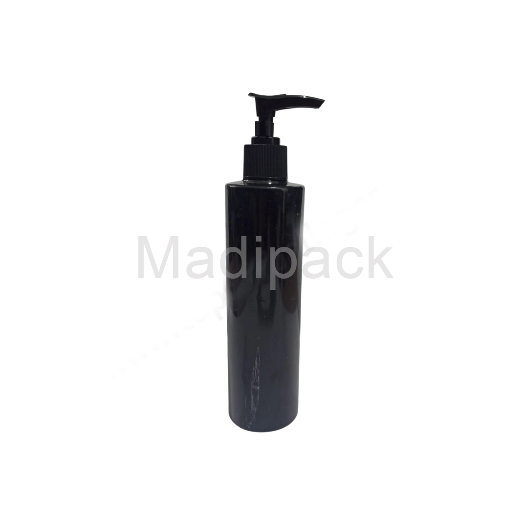 250 ml bottles in opaque black plastic.