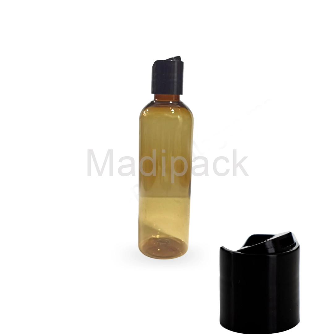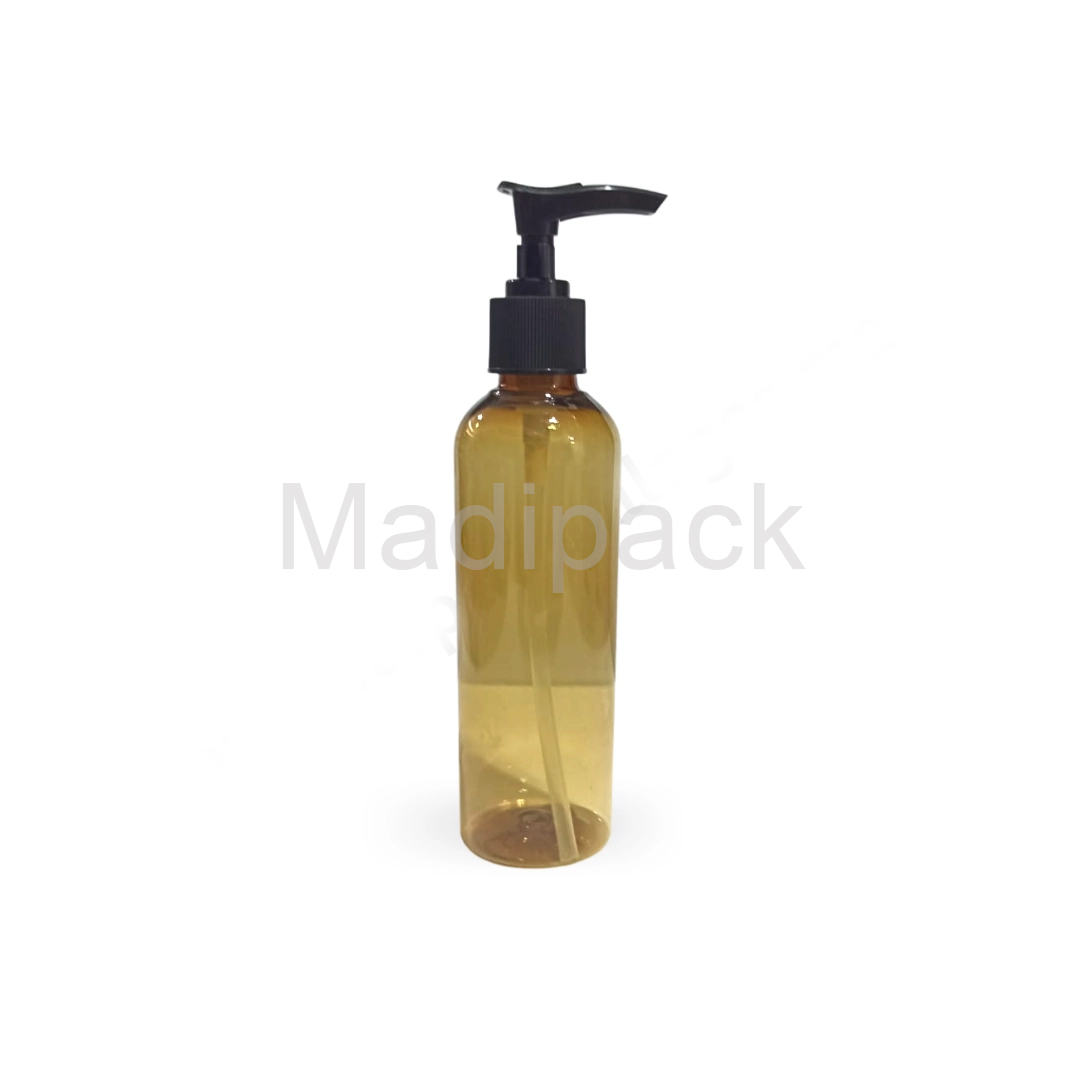 200 ml bottles in transparent brown plastic.